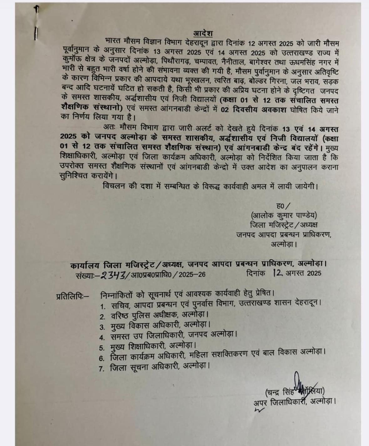 उत्तराखण्ड अल्मोड़ा जनपद के समस्त विद्यालयों और शैक्षणिक संस्थाओं में 13 और 14 अगस्त को रहेगा अवकाश। Prakash Chandra agari 2 months ago भारत मौसम विज्ञान विभाग की चेतावनी के बाद भारत मौसम विज्ञान विभाग की चेतावनी के बाद अल्मोड़ा जनपद के समस्त विद्यालयों और शैक्षणिक संस्थाओं में 13 और 14 अगस्त को रहेगा अवकाश। Continue Reading Previous: सौनी-बिनसर में गधेरे पार करते वक्त युवक की हुई मौत।Next: महेश चंद्र आर्या चुने गए केन्द्र कर्मचारी समिति के अध्यक्ष। Leave a Reply Cancel replyYour email address will not be published. Required fields are marked *Comment * Name * Email * Website Save my name, email, and website in this browser for the next time I comment. वेब स्टोरी जिलाधिकारी ने किया जिला अस्पताल का औचक निरीक्षण। उत्तर प्रदेश उत्तराखण्ड देश देहरादून नई दिल्ली जिलाधिकारी ने किया जिला अस्पताल का औचक निरीक्षण। Prakash Chandra agari 6 minutes ago बुढ़ाकेदार में बहुजन चेतना पर विमर्श : बामसेफ और मूलनिवासी संघ का साझा प्रयास। 1 min read उत्तर प्रदेश उत्तराखण्ड देश देहरादून नई दिल्ली बुढ़ाकेदार में बहुजन चेतना पर विमर्श : बामसेफ और मूलनिवासी संघ का साझा प्रयास। Prakash Chandra agari 8 hours ago संविधान जागरूकता और संगठन सशक्तिकरण के लिए बामसेफ-मूलनिवासी संघ का एकदिवसीय कैडर कैंप घनसाली में हुआ संपन्न। 1 min read उत्तर प्रदेश उत्तराखण्ड देश देहरादून नई दिल्ली संविधान जागरूकता और संगठन सशक्तिकरण के लिए बामसेफ-मूलनिवासी संघ का एकदिवसीय कैडर कैंप घनसाली में हुआ संपन्न। Prakash Chandra agari 8 hours ago सतना में पीपीआईडी का एकदिवसीय कैडर कैंप हुआ संपन्न। उत्तर प्रदेश उत्तराखण्ड देश देहरादून नई दिल्ली सतना में पीपीआईडी का एकदिवसीय कैडर कैंप हुआ संपन्न। Prakash Chandra agari 23 hours ago वाहनों की सघन चेकिंग के दौरान 55250 रुपये का जुर्माना वसूला। उत्तर प्रदेश उत्तराखण्ड देश देहरादून नई दिल्ली वाहनों की सघन चेकिंग के दौरान 55250 रुपये का जुर्माना वसूला। Prakash Chandra agari 2 days ago 60 वर्षीय पुरुष और 61 वर्षीय महिला की सकुशल बरामदी, परिजनों के सुपुर्द। उत्तर प्रदेश उत्तराखण्ड देश देहरादून नई दिल्ली 60 वर्षीय पुरुष और 61 वर्षीय महिला की सकुशल बरामदी, परिजनों के सुपुर्द। Prakash Chandra agari 3 days ago