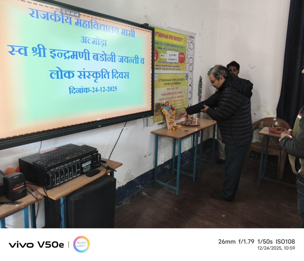 मासी (अल्मोड़ा) आज दिनांक 24/12/2025 को प्राचार्य डॉ अखिलेश कुमार शुक्ल की अध्यक्षता में इन्द्रमणी बडोनी की जयंती के अवसर पर महाविद्यालय में लोकसंस्कृति दिवस मनाया गया। डॉ पुष्कर कांडपाल ने उत्तराखंड के गाँधी- पूज्य इन्द्रमणी बडोनी के बारे में विस्तार से चर्चा की। उत्तराखंड आन्दोलन में बडोनी के योगदान पर डॉ गौरव कुमार ने अपने विचार व्यक्त किये। प्राचार्य डॉ अखिलेश कुमार शुक्ल ने उत्तराखंड की लोक संस्कृति के संरक्षण के लिए अपने सुझाव प्रस्तुत किये। उक्त अवसर पर डॉ अनुराधा, डॉ लता शाह, डी. एस. रजवार, गीता तिवारी इत्यादि उपस्थित रहे। मंच संचालन कार्यक्रम संयोजक डॉ पुष्कर कांडपाल ने किया।