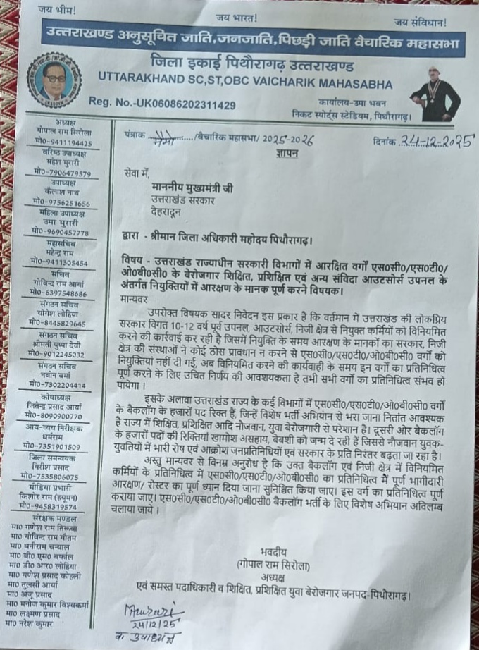 पिथौरागढ़ आज दिनांक 24 दिसंबर 2025 को एससी, एसटी, ओबीसी वैचारिक महासभा जिला इकाई पिथौरागढ़ उत्तराखंड के द्वारा एक ज्ञापन जिलाधिकारी पिथौरागढ़ के माध्यम से मुख्यमंत्री को भेजा गया। ज्ञापन के माध्यम से उत्तराखंड में वर्षों से रिक्त पड़े एससी, एसटी व ओबीसी वर्ग के बैकलॉग पदों को शीघ्र भरने की माँग की गई।