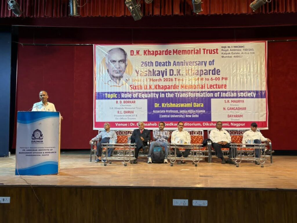 नागपुर (महाराष्ट्र) नागपुर D.K. Khaparde Memorial Trust द्वारा बामसेफ संस्थापक यशकायी डी.के. खापर्डे की 26वीं पुण्यतिथि के अवसर पर 6वां स्मृति व्याख्यान का आयोजन किया गया। यह कार्यक्रम रविवार, 01 मार्च 2026 को दोपहर 3:00 बजे से शाम 6:00 बजे तक Dr. Babasaheb Ambedkar Auditorium, दीक्षाभूमि, नागपुर में संपन्न हुआ।