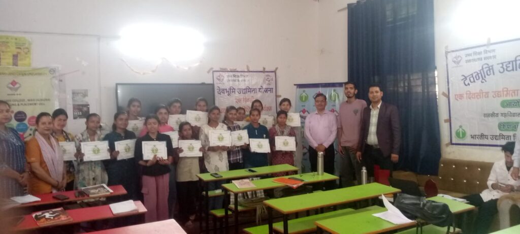 मासी (अल्मोड़ा) दिनांक 24 अप्रैल 2026 को देवभूमि उद्यमिता योजना के अन्तर्गत राजकीय महाविद्यालय मासी अल्मोड़ा में एक दिवसीय कार्यशाला आयोजित की गयी। कार्यशाला का प्रारम्भ समिति के नोडल आफिसर डॉ पूरन राम द्वारा किया गया। कार्यशाला में योजना के प्रोग्राम आफिसर महेन्द्रसिंह रौतेला द्वारा छात्र-छात्राओं को उद्यमिता के विषय में बताया गया तथा छात्र-छात्राओं को स्टार्ट अप के लिए प्रेरित किया गया। कार्यशाला की समाप्ति के बाद छात्र-छात्राओं को प्रमाण पत्र वितरित किये गये। इस अवसर पर प्राचार्य प्रो ए.के.शुक्ला, डॉ. अनुराधा, डॉ. गौरव कुमार, डॉ. निशा, डॉ. पुष्कर कांडपाल, लता शाह तथा अन्य स्टाफ आदि मौजूद रहे।